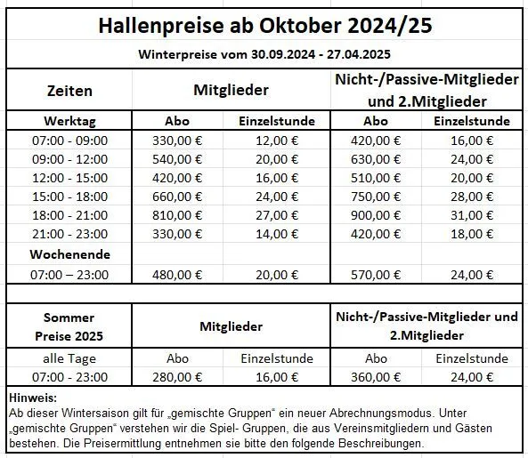 Informationen zur Preisgestaltung der Hallenpreise Winter/Sommer